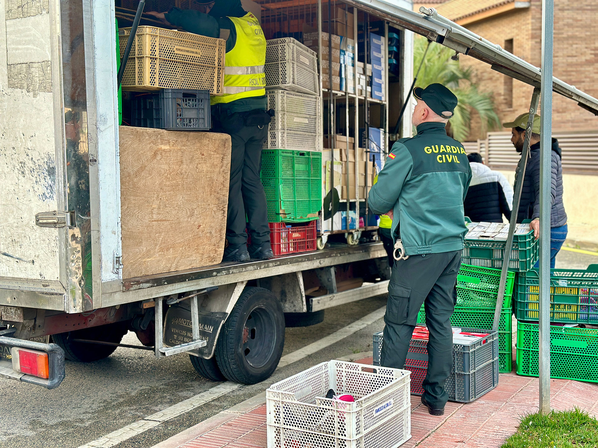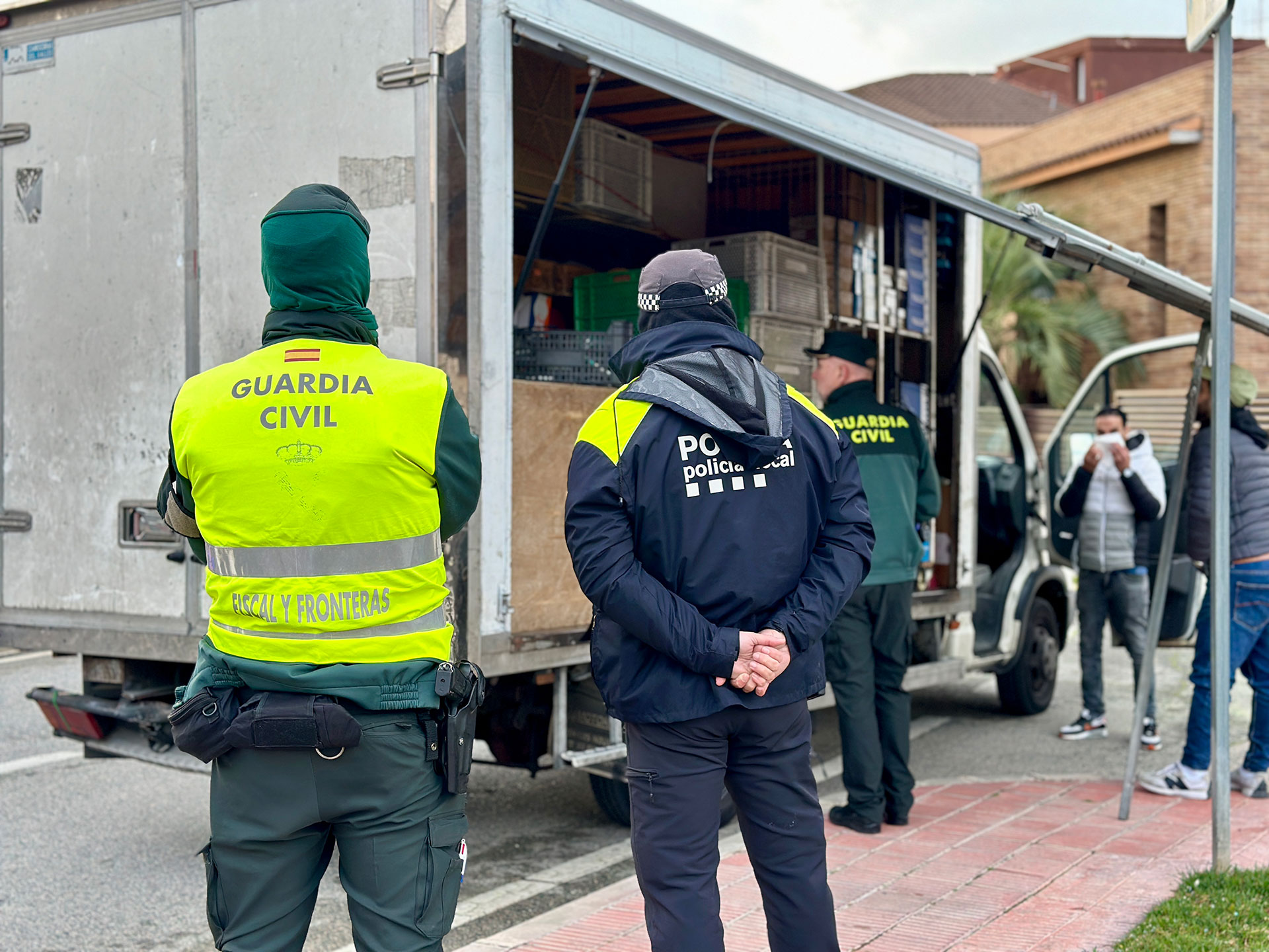 Aquest matí, vuit membres de la Guàrdia Civil i dues patrulles de la Policia Local han realitzat un dispositiu conjunt a l’accés principal del nucli urbà, a la plaça Francesc Macià, per a detectar i intervenir productes falsificats.