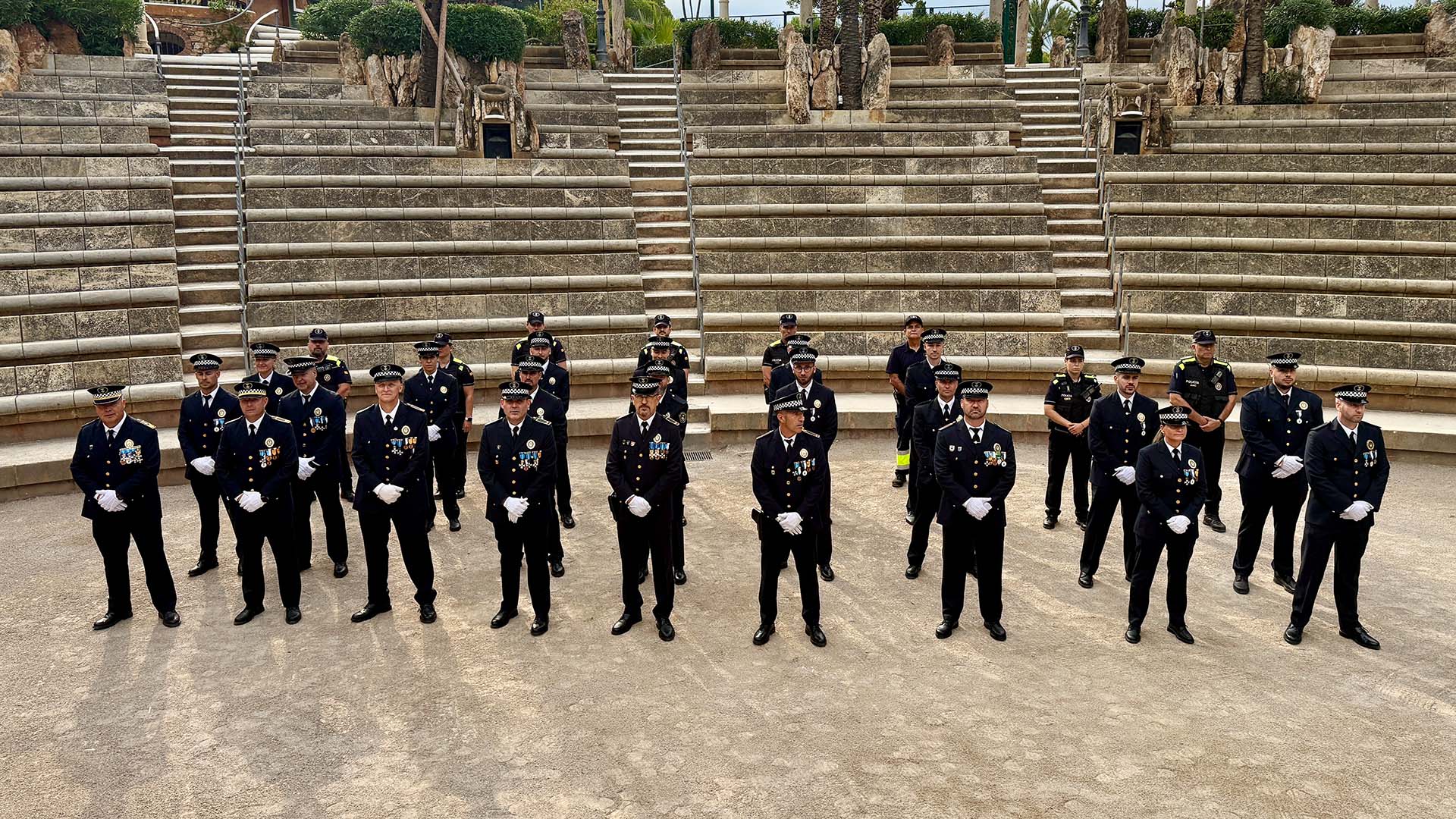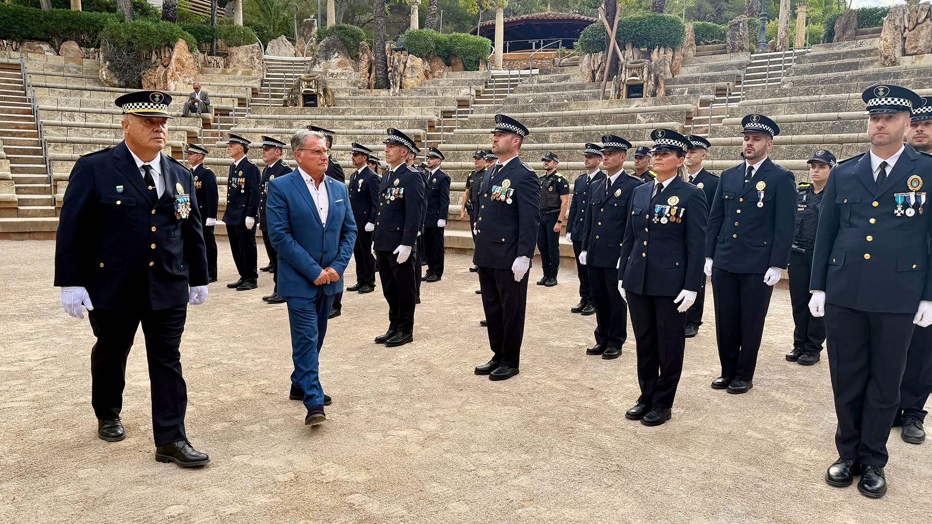 La cita s’ha iniciat passats dos quarts d’onze, amb la formació de tota la plantilla a l’amfiteatre del resort, on l’alcalde Pere Virgili i el sotsinspector en cap, Antonio Gómez, han passat revista.