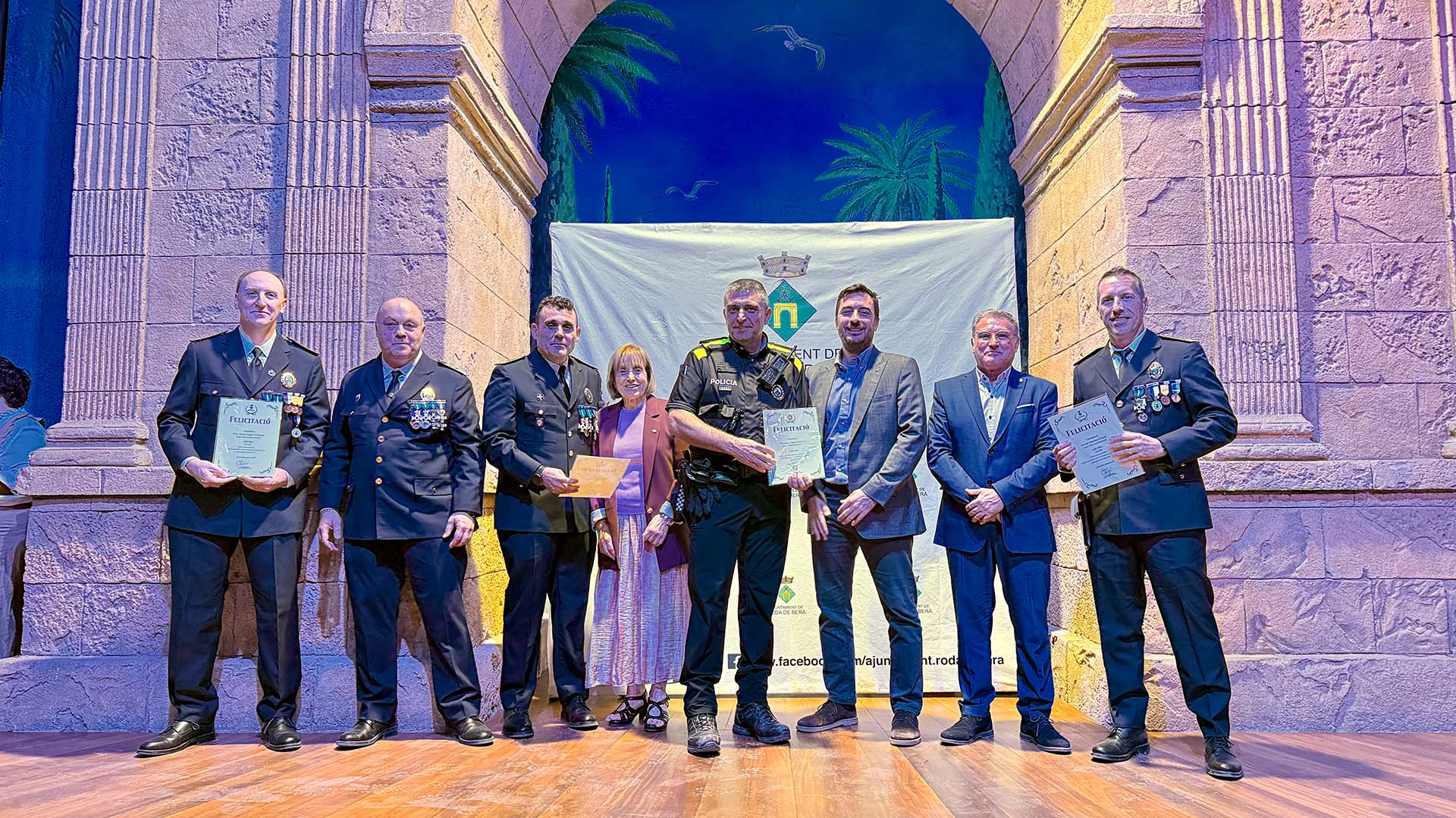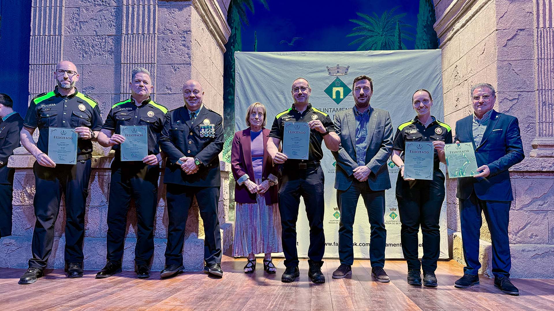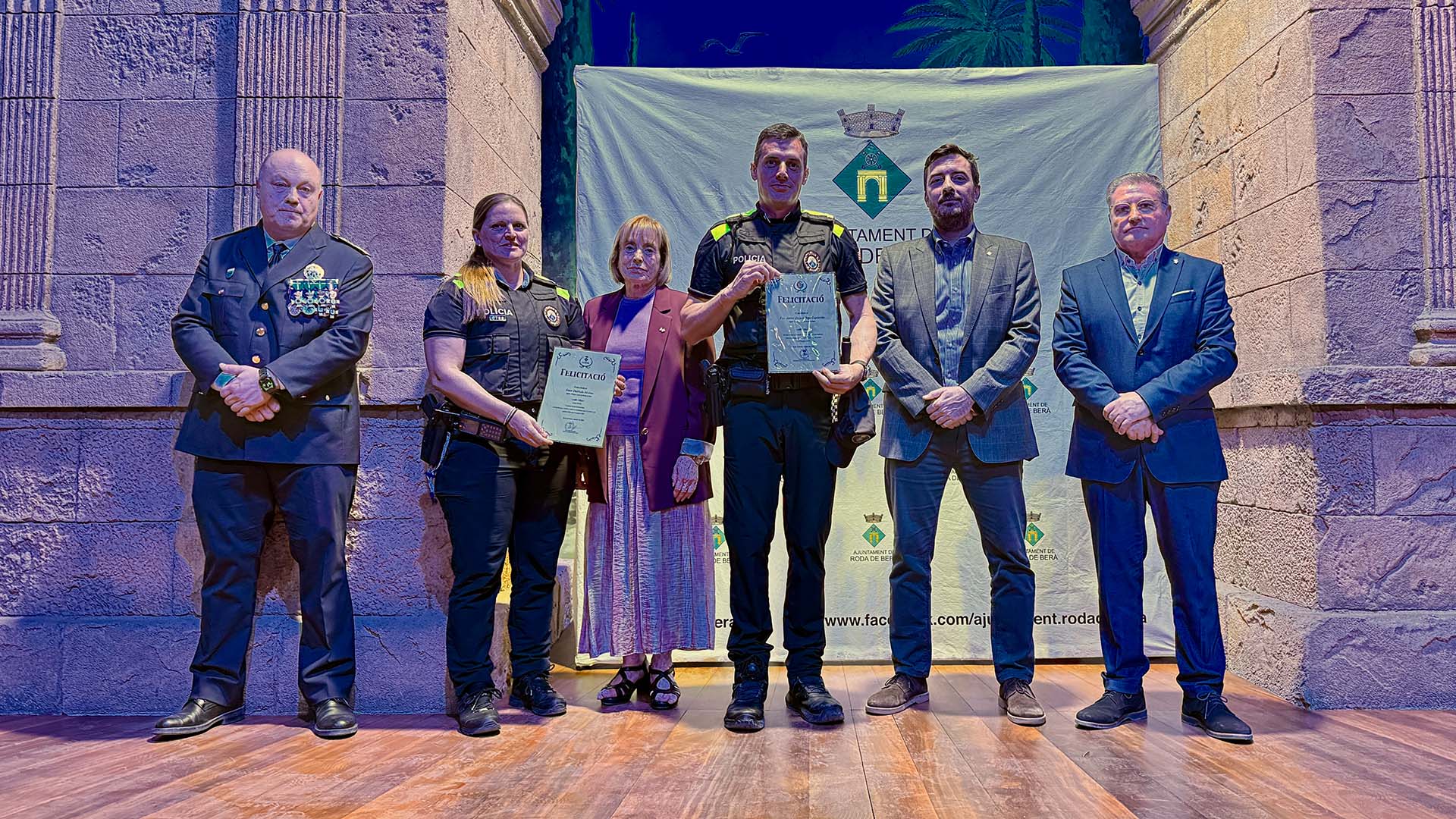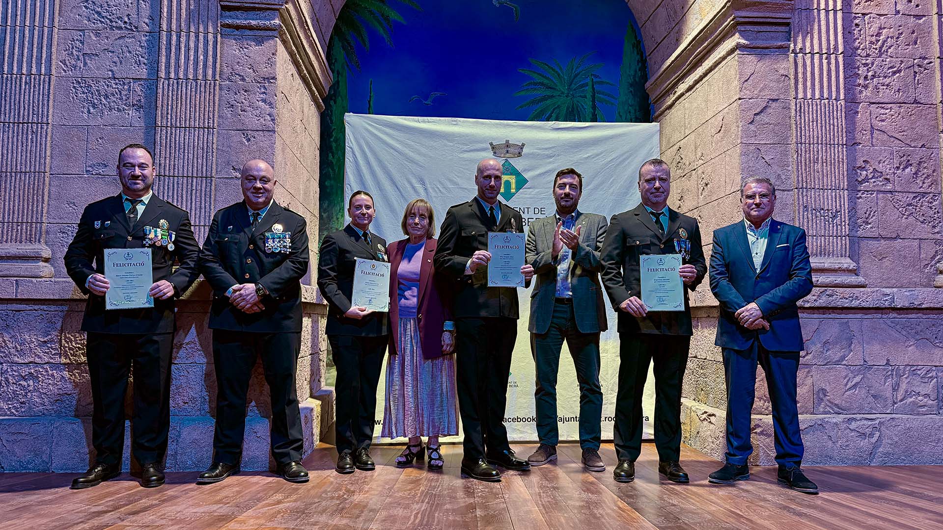 A continuació, s’ha iniciat el lliurament de medalles, diplomes i felicitacions, fins prop d’una vuitantena, amb la presència a l’escenari de l’alcalde; del cap de la Policia Local rodenca; del director general de Coordinació de les Policies Locals; i de la primera tinent d’alcalde, Teresa Ferré.