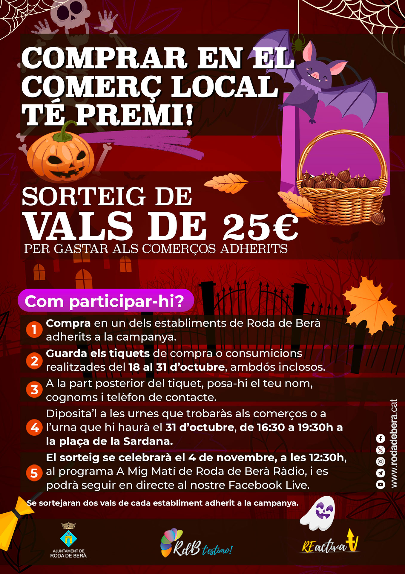 5. El sorteig se celebrarà el 4 de novembre, a les 12:30h, al programa A Mig Matí, de Roda de Berà Ràdio, i es podrà seguir en directe al nostre Facebook Live.