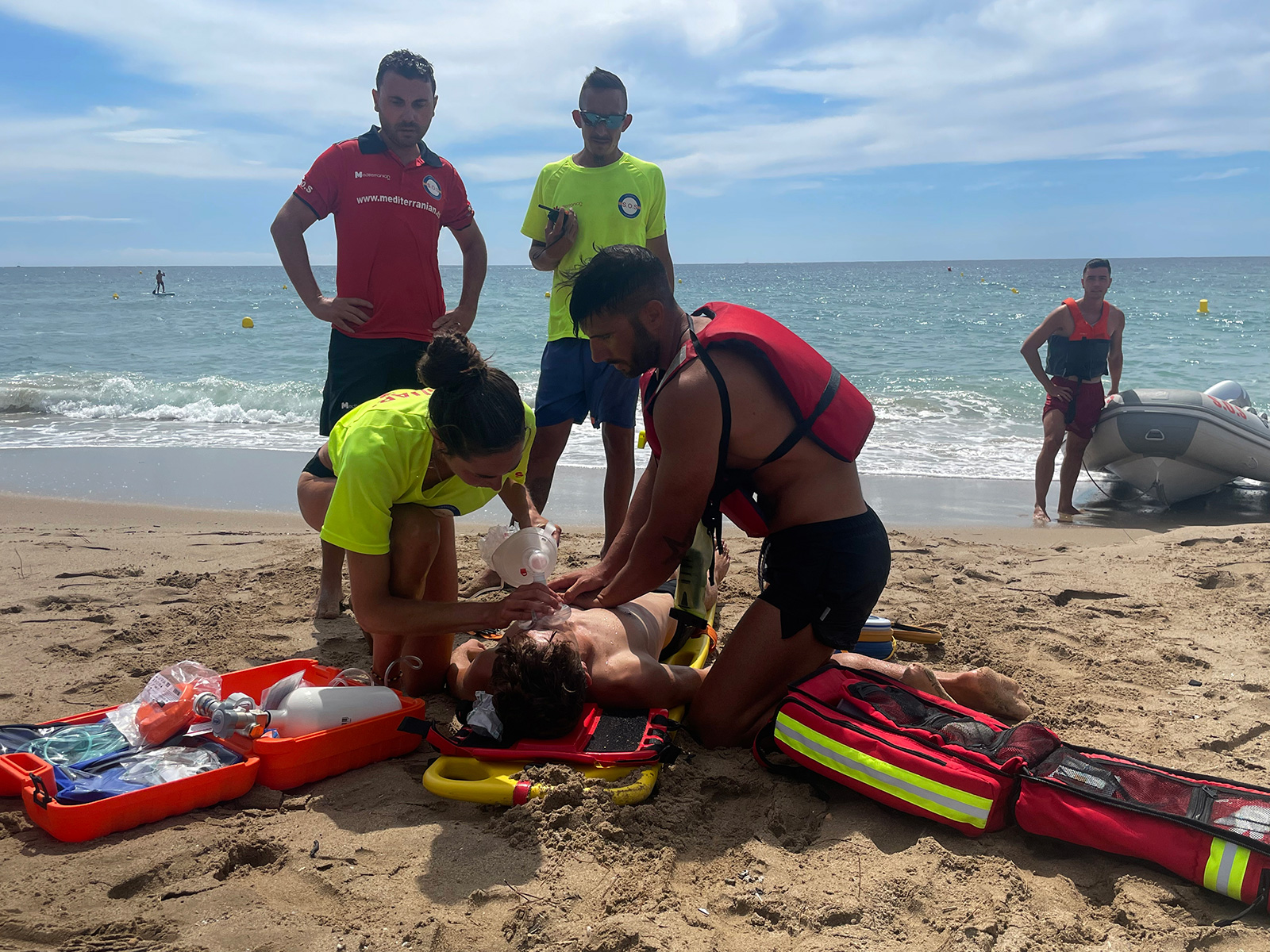 El simulacre ha començat quan la víctima, en un primer moment activa, ha mostrat que es trobava en perill dins de l’aigua. Ràpidament un dels socorristes l’ha identificat i ha donat avís a la resta de companys els qui han activat el protocol de rescat aquàtic. En arribar amb l’embarcació fins a la víctima han descobert que aquesta havia perdut la consciència i l’han portat fins a la sorra. Allà els socorristes li han realitzat la maniobra de reanimació cardiopulmonar, amb l’ajuda d’un equip d’oxigenoteràpia, fins assolir la seva reanimació i l’han col·locat a la taula espinal per immobilitzar-la, a l’espera que els tècnics sanitaris del SEM hi arribessin.